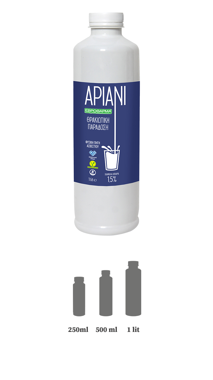 Ελιξίριο ζωής και μυστικό μακροζωίας ! Έτσι αναφέρεται στις παραδόσεις των λαών της Ανατολής και έτσι σας το προσφέρει η Εβροφάρμα , φτιαγμένο με τον φυσικό θρακιώτικο τρόπο, από το δικό μας ανυπέρβλητο φρέσκο γάλα και το εξαιρετικό δικό μας γιαούρτι. Πρόκειται για ένα υγιεινό αναψυκτικό – γιαουρτοποτό, πραγματικό θαύμα δροσιάς, ευεξίας και απόλαυσης. Για να ξεδιψάσετε γευστικά και να πάρετε νέες δυνάμεις πάρετε Αριάνι. Ίσως η πιο υγιεινή πρόταση για να συνοδεύσει το μεσημεριανό σας φαγητό !